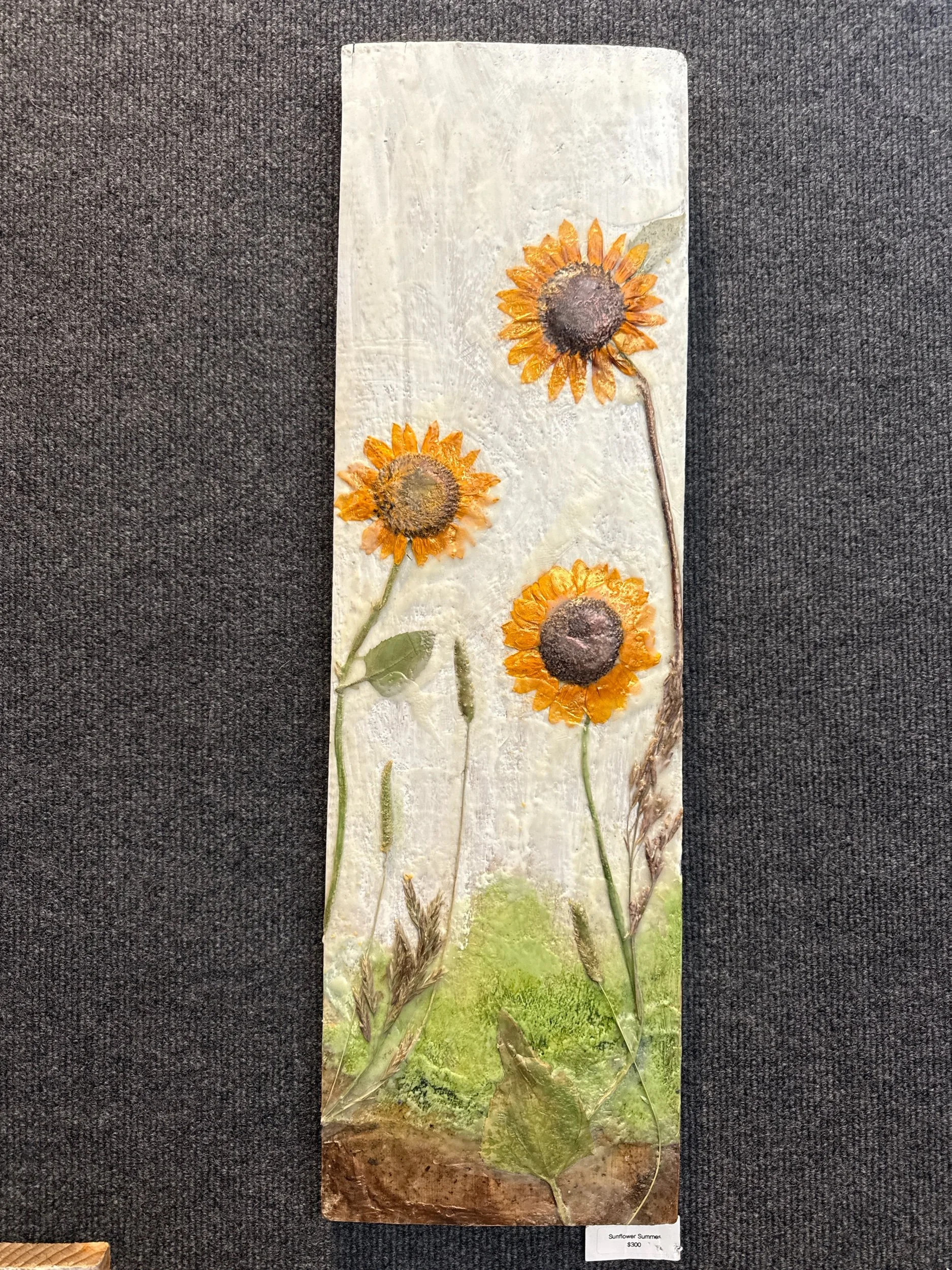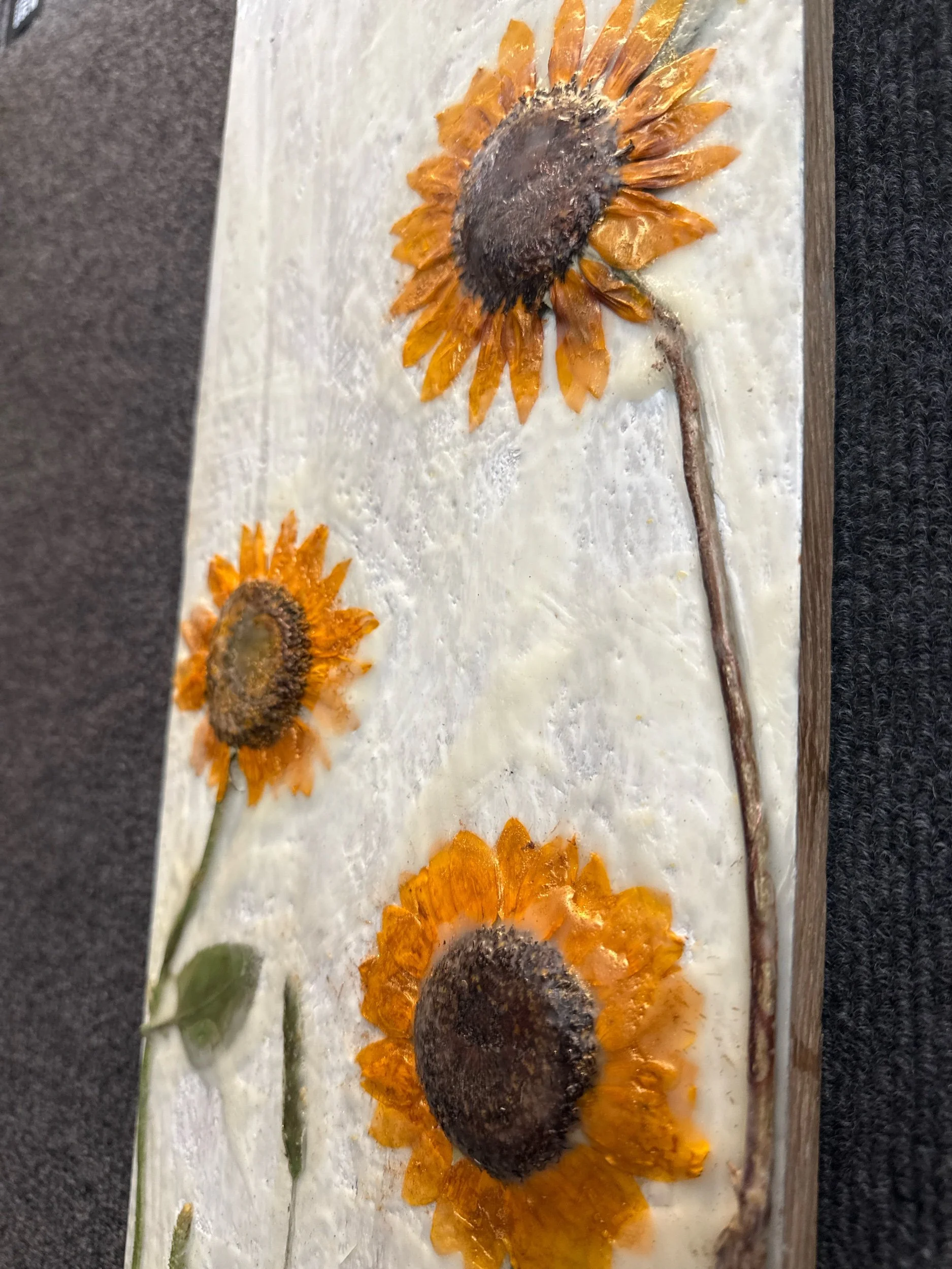 Encaustic (beeswax + tree resin) botanical collage of real dried sunflowers, grasses & handmade paper on plank of reclaimed wood (7x24 inches long).