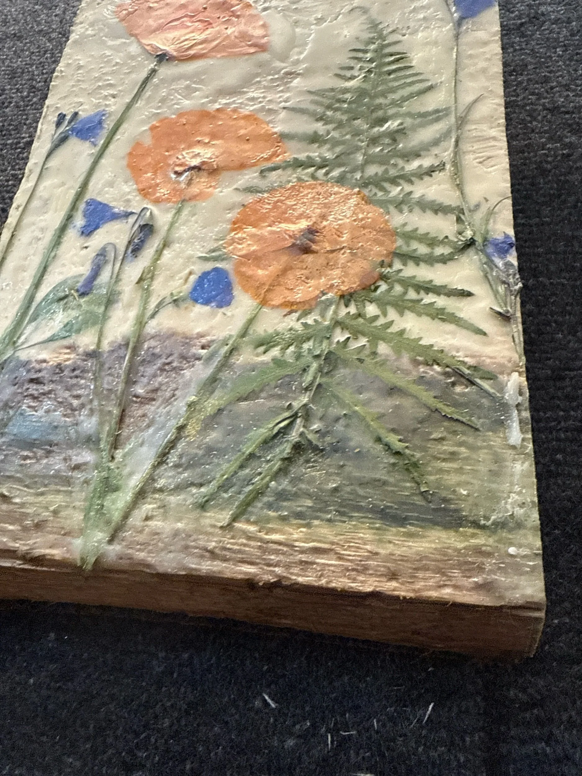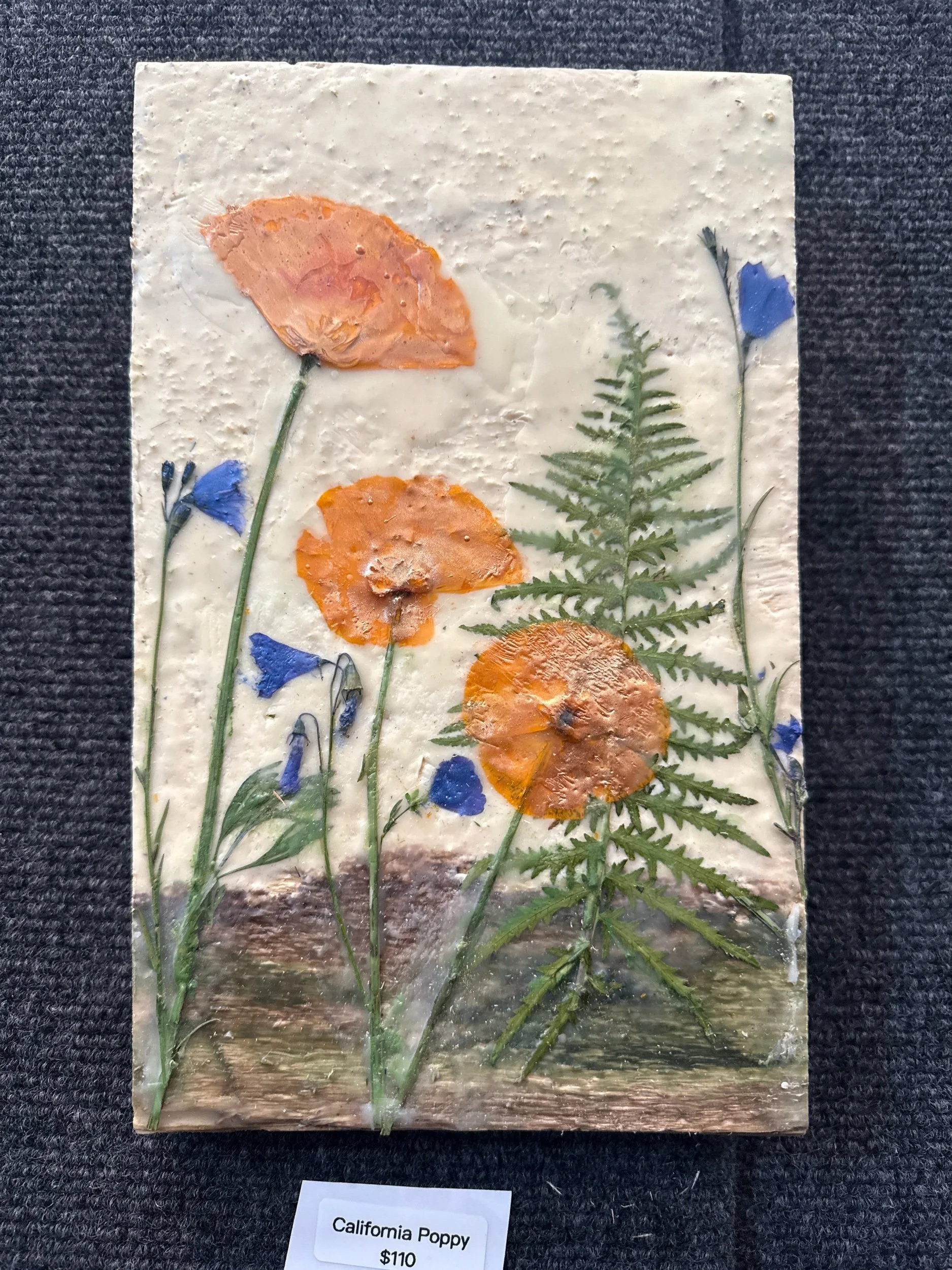 Encaustic botanical collage with preserved specimens of California poppy, fern and Scottish bluebells on plank of live edge pine board 6x10 inches.