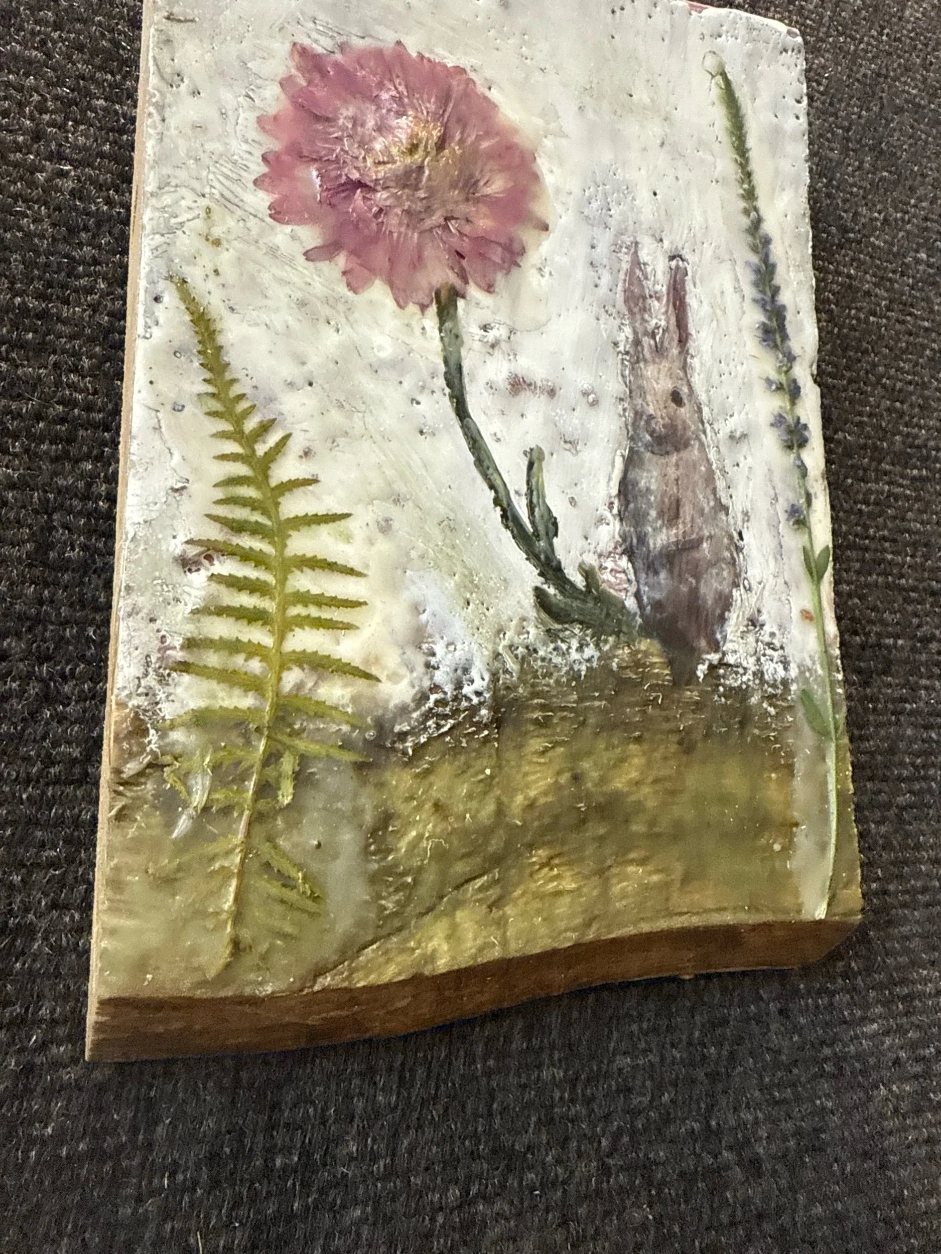Encaustic (beeswax & tree resin) botanical collage with preserved chrysanthemum, fern and speedwell Veronica with bunny accent on a slab of live - edge chainsaw milled pine board. (9x6 inches wide).