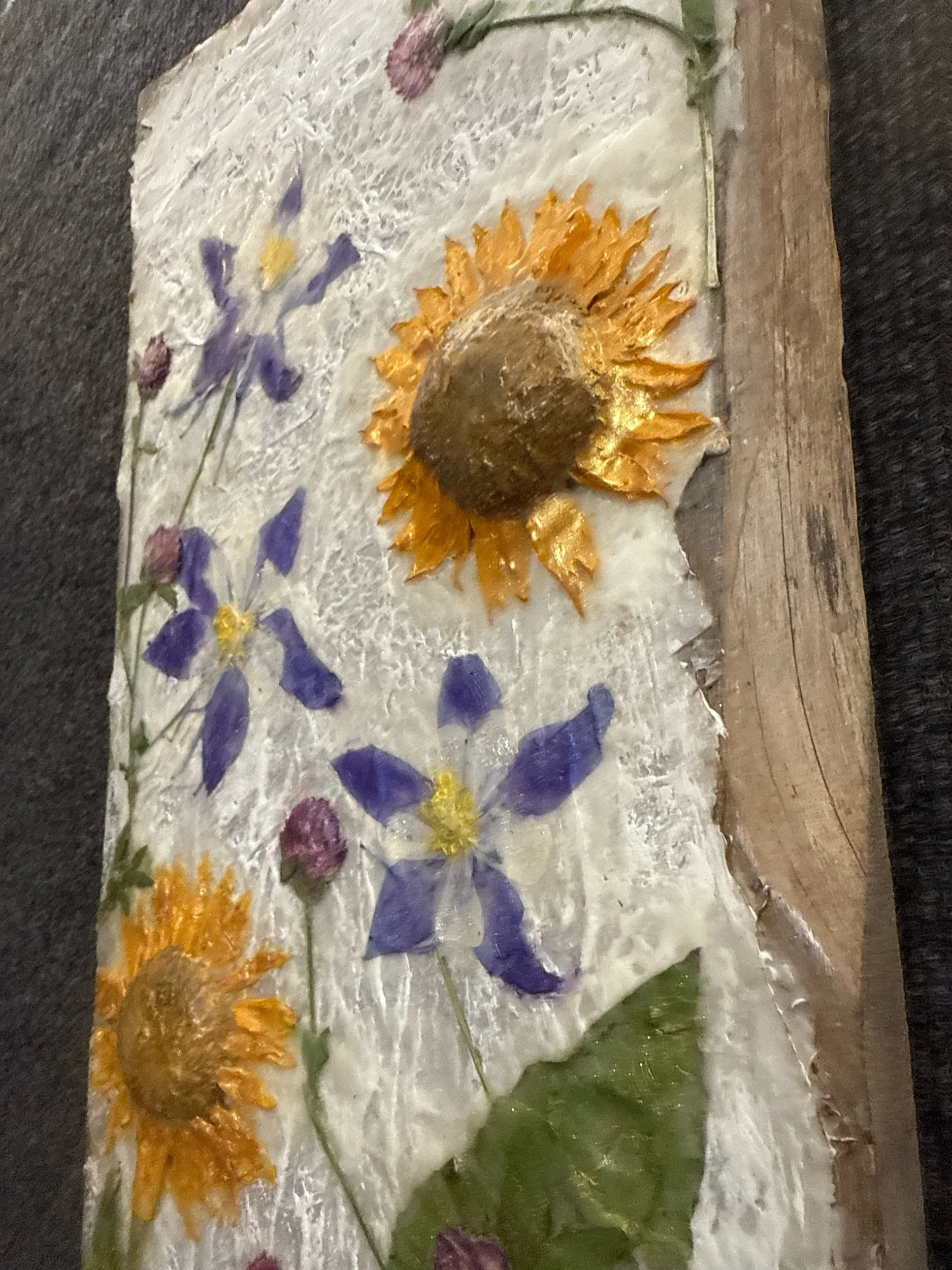 Encaustic (beeswax & resin) botanical collage with preserved specimens of sunflowers, columbine, and red clover on large plank of reclaimed wood ( 85x24 inches).